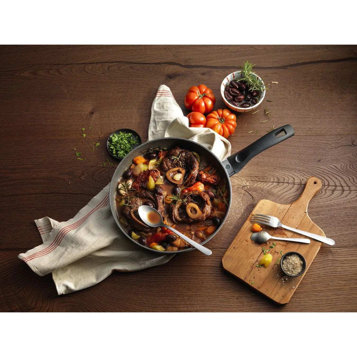 Der hitzebeständige Bimetall-Boden aus Stahl und Aluminium mit einem massiven Aluminiumkern speichert die Hitze und leitet sie gleichmäßig weiter, sodass sich die Pfannen schnell aufheizen. Für eine sichere Handhabung sorgt der ergonomisch geformte Pfannenstiel mit Thermoisolation und integriertem Edelstahl-Flammschutz. Zudem ist die Thermopoint-Technologie in die Stiele integriert: Der rote Punkt signalisiert, dass die ideale Temperatur erreicht ist, um mit dem Braten zu beginnen. So können Sie die Temperatur rechtzeitig drosseln und energiesparend kochen. Grün zeigt an, dass sich die Pfanne in der Abkühlphase befindet und gefahrlos berührt werden kann. Reinigen lässt sich die Pfanne ganz komfortabel in der Spülmaschine oder einfach mit einem feuchten Tuch.