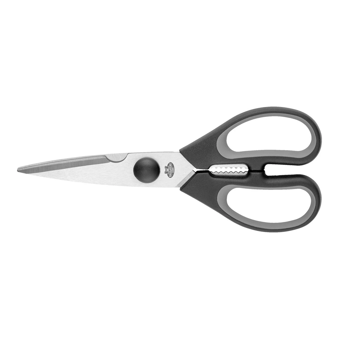 Diese 19 cm lange Schere verfügt neben zwei glatten Scherenblättern auch über einen Drehverschlußöffner. Die Vielzweckschere besteht aus rostfreiem Spezialstahl. Ebenso wie die leichten Kunststoffgriffe wurde der Stahl speziell gehärtet und erweist sich damit im Alltag als besonders widerstandsfähig. Mit diesem praktischen Helfer durchtrennen Sie nicht nur Papier und Stoffe sauber, sondern zerschneiden auch kräftige Verpackungsmaterialien mühelos.