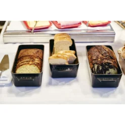 In der schwarzen Kastenform aus der Reihe STAUB Spezialitäten backen Sie beispielsweise ein frisches Brot oder einen leckeren Kuchen. Sie besteht aus Gusseisen, das die Hitze optimal verteilt, sodass Ihre Speisen an allen Stellen gleichmäßig gar werden und das Brot eine schöne Kruste bekommt und innen sehr fluffig ist. Gusseisen ist außerdem extrem robust und langlebig. Solch eine Kastenform können Sie deshalb über viele Jahre benutzen. Eine Besonderheit der Kastenform von STAUB ist zudem nicht nur die optimale Hitzebeständigkeit sondern auch das lange Kühlhalten von kalten Speisen. So können Sie beispielsweise auch selbstgemachtes Eis perfekt kühl stellen und direkt danach auf dem gedeckten Tisch stilvoll servieren. Die Kastenform hat eine Länge von 23 cm, eine Breite von rund 12 cm und eine Höhe von 7cm. Ihr Fassungsvermögen beläuft sich dadurch auf 1,56 l. Die schwarze Kastenform von STAUB ist durch ihre beiden Griffe an den Kopfseiten sehr praktisch in der Handhabung. In ihr backen Sie leicht ein gesundes Brot für Ihre Familie, einen Kuchen für die Kaffeetafel oder servieren stilvoll ein kaltes Dessert. Durch die Emaillierung an der Innenseite lassen sich die Backwaren leicht aus der Form lösen. Auch die Reinigung ist hierdurch leicht, denn mit etwas Spülmittel ist die Kastenform schnell wieder sauber.