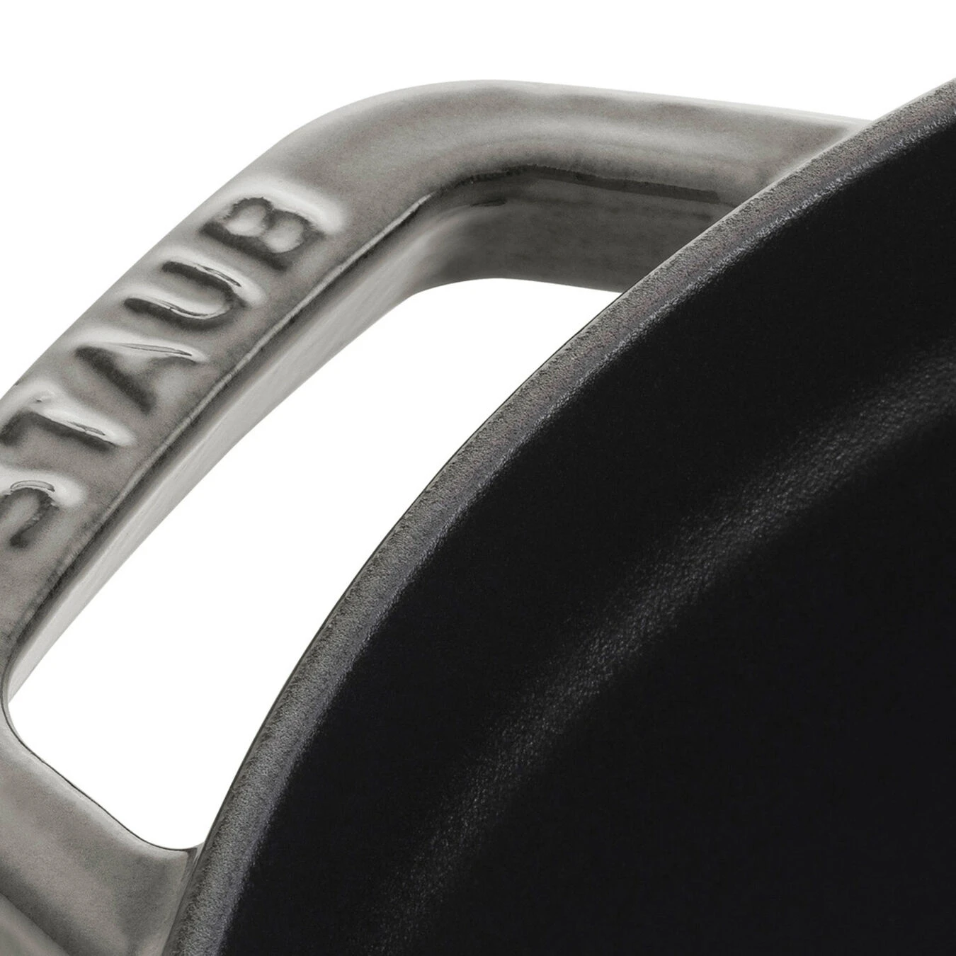 Die Cocotte von Staub ist ein gusseiserner Bräter, welcher auf der Innenseite mit einer mattschwarzen Emaillierung überzogen ist. Zu den Hauptvorteilen dieser Emaille-Schicht gehören die sofortige Gebrauchsfähigkeit, der gute Schmoreffekt sowie die Tatsache, dass sich die Eigenschaften des Materials mit jedem Gebrauch verbessern. Die gusseiserne Cocotte speichert die Wärme ganz gleichmäßig und verteilt sie langsam an das Bratgut. Rezepte, bei denen Sie scharf anbraten und im Anschluss langsam bei niedrigen Temperaturen schmoren, sind daher gut umsetzbar. Da das Material auch Kälte speichert, eignet sich die Cocotte ebenfalls für die Zubereitung von Desserts und Kaltschalen. Der runde Schmortopf aus der Serie La Cocotte hat einen Durchmesser von 20 cm. Die Höhe ohne Deckel beträgt 9,5 cm, das Fassungsvermögen 2,2 l. Inklusive der beiden Griffe hat die Cocotte eine Länge von 26,3 cm und passt deshalb problemlos in alle Öfen. Eine tropfenförmige Deckelstruktur lässt das Kondenswasser gleichmäßig auf das Schmorgut herabtröpfeln. Fleisch und andere Gerichte werden daher besonders saftig und zart. Das klassische Design und die grafitgraue Farbe machen die Cocotte außerdem zu einem edlen Serviergefäß, das auf Ihrem Tisch gut zur Geltung kommt. Mit der Emaillierung im Inneren, die den natürlichen Eigengeschmack der Speisen noch verstärkt, begeistern Sie Ihre Familie oder Gäste mit besonders schmackhaften Gerichten, die Sie gleich in der Cocotte servieren können.