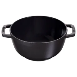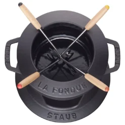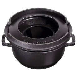 Das STAUB Fondue-Set aus Gusseisen macht den geselligen Abend mit der Familie oder mit Freunden zum gemütlichen kulinarischen Erlebnis. Neben dem Fonduetopf erhalten Sie vier passende Gabeln zum Aufspießen von Fleisch und Fisch, saftigem Obst oder auch knackigem Gemüse. Sie entscheiden selbst, wonach Ihnen ist: Soll es würziges Käsefondue sein wie bei den Schweizern, Fleischfondue nach Winzer-Art mit feinem Wein oder ein chinesisches Fondue mit exotischem Gemüse und Brühe? Der Fonduetopf mit 16 cm Durchmesser von STAUB hat ein Fassungsvermögen von 1,1 l. Das zugehörige Rechaud bietet Platz für den Brenner. Nach dem Gebrauch lässt sich das STAUB-Fondue-Set platzsparend verstauen. Dazu wird das Rechaud einfach umgedreht – so passt es genau in den Topf hinein. Dank zwei seitlichen Griffen aus Gusseisen greifen Sie den Topf nach dem Erwärmen der Flüssigkeit auf dem Herd sicher mit beiden Händen und tragen ihn zum Tisch. Das Material hält die Hitze besonders lang. So machen Sie es sich mit Ihren Gästen gemütlich, führen anregende Gespräche während des Essens und erleben gleichzeitig anhaltenden Genuss. Gusseisen hat außerdem den Vorteil, dass es sehr robust, langlebig und leicht zu reinigen ist. Das Fondue-Set hat an der Außenseite eine mattschwarze Farbe. Mit dem Set von STAUB servieren Sie leckeres Fondue stilecht und machen Eindruck bei Ihren Gästen.