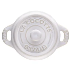 Die elfenbeinweiße Mini-Cocotte der Serie Ceramic by STAUB bietet sich für die Zubereitung kleiner Mengen oder das Servieren kleiner Portionen an. Sie besteht aus Keramik und eignet sich daher auch zum Backen im Ofen. Für andere Zwecke, wie beispielsweise für das Aufwärmen kleiner Mahlzeiten in der Mikrowelle, können Sie die Cocotte ebenfalls verwenden. Dank ihrer Größe ist sie ideal für ein portionsweises Zubereiten und Servieren. Die Mini-Cocotte von STAUB wird aus besonders hochwertiger Keramik gefertigt und anschließend mit einer speziellen Glasur versehen. Diese Glasur sorgt für eine lange Lebensdauer und verleiht der Cocotte gleichzeitig ihre besondere Optik. Die kleine Cocotte können Sie dank dieser insbesondere zum Servieren am Tisch nutzen. Aufgrund der vielen Verwendungsmöglichkeiten werden die Mini-Cocottes von STAUB, die stets Unikate sind, auch gern als kleine Mitbringsel für Freunde oder Verwandte genutzt. Die STAUB Mini-Cocotte besitzt zwei Henkel, durch die sie sich gut handhaben lässt, und einen passenden Deckel. Darüber hinaus hält er die Speisen bei Gebrauch am Tisch länger warm. So können Sie sich beim Genuss Ihrer Speisen Zeit lassen. Die emaillierte Oberfläche sorgt für eine leichte Reinigung nach dem Essen. Mit der elfenbeinweißen Mini-Cocotte von STAUB machen Sie die gemeinsame Mahlzeit zu einem Genuss.