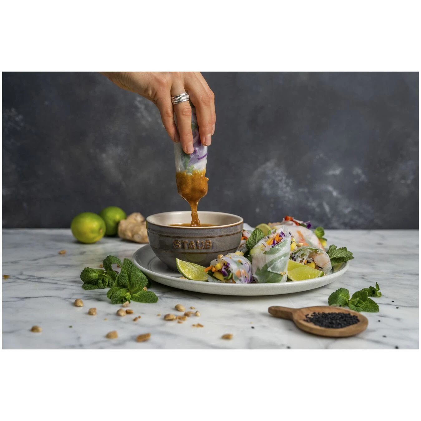 Die antikgraue Rührschüssel aus der Serie Ceramic by STAUB ist ein Schmuckstück für jede Küche. Jedes Stück ist ein Unikat. In dieser stilvollen Rührschüssel vermengen Sie verschiedene Zutaten für Ihre Salatsaucen. Ebenso gut können Sie die Schüssel zum Servieren und für die Aufbewahrung von kleineren Lebensmitteln wie beispielsweise Kirschtomaten benutzen. Sie besteht aus einem hochwertigen Material, das sich für die Lagerung von Lebensmitteln bestens eignet. Die antikgraue Rührschüssel aus Keramik hat einen Durchmesser von 12 cm. Sie ist mit einer Spezialglasur versehen, die ihr eine besonders stilvolle, antik wirkende Optik verleiht. Die Rührschüsseln und andere Produkte besitzen außerdem eine Aufschrift mit der Marke STAUB. Dadurch haben die Stücke einen hohen Wiederkennungswert. Mit dieser türkisfarbenen Rührschüssel, die gleichermaßen durch die hochwertige Keramik und ihr schönes Design überzeugt, machen Sie bei Ihren Gästen Eindruck und das gemeinsame Essen zu einem kulinarischen Erlebnis.