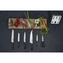 - Enthält 1 Spick- und Garniermesser (10 cm), 1 Universalmesser (13 cm), 1 Fleischmesser (16 cm), 1 Kochmesser (20 cm), 1 Brotmesser (20 cm), 1 Vielzweckschere, 1 Block