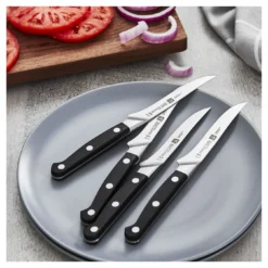Spitzenklasse modern interpretiert: Diese geschmiedeten Premium-Messer im Nietendesign haben einen von Stardesignern Matteo Thun und Antonio Rodriguez schlank gestalteten Kropf (zwischen Griff und Klinge), der Ästhetik und Performance verbindet. Wenn du hohe Erwartungen an deine Küchenmesser hast, liegst du mit diesem hochwertigen Messer genau richtig und kannst dich auf Qualität, Schärfe und ergonomisches Design freuen. Das Steakmesser eignet sich für das mühelose Zerteilen von gebratenem und gegrilltem Fleisch, unter anderem für Rindfleisch, Schweinfleisch oder Lammfleisch. Der fugenlos verarbeitete Griff aus Kunststoff liegt beim Arbeiten gut in der Hand. Die FRIODUR Klinge aus rostfreiem Stahl wurde eisgehärtet, wodurch sie gleichzeitig besonders schneidhaltig und sehr flexibel ist. Das in Deutschland hergestellte Messer überzeugt durch seine sorgfältige und hochwertige Verarbeitung.