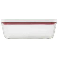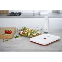 Die Vakuum Box macht mit den roten Farbakzenten in Ventil und Dichtung im Kühlschrank, aber auch beim Servieren am Tisch, eine gute Figur. Zu dem ist sie dank dem bruchsicheren Borosilikatglas auch geeignet für die Verwendung im Ofen bis 180°C ohne Deckel. Da die Kühlschrankbox spülmaschinengeeignet ist, kannst du sie nach Gebrauch leicht reinigen.