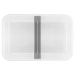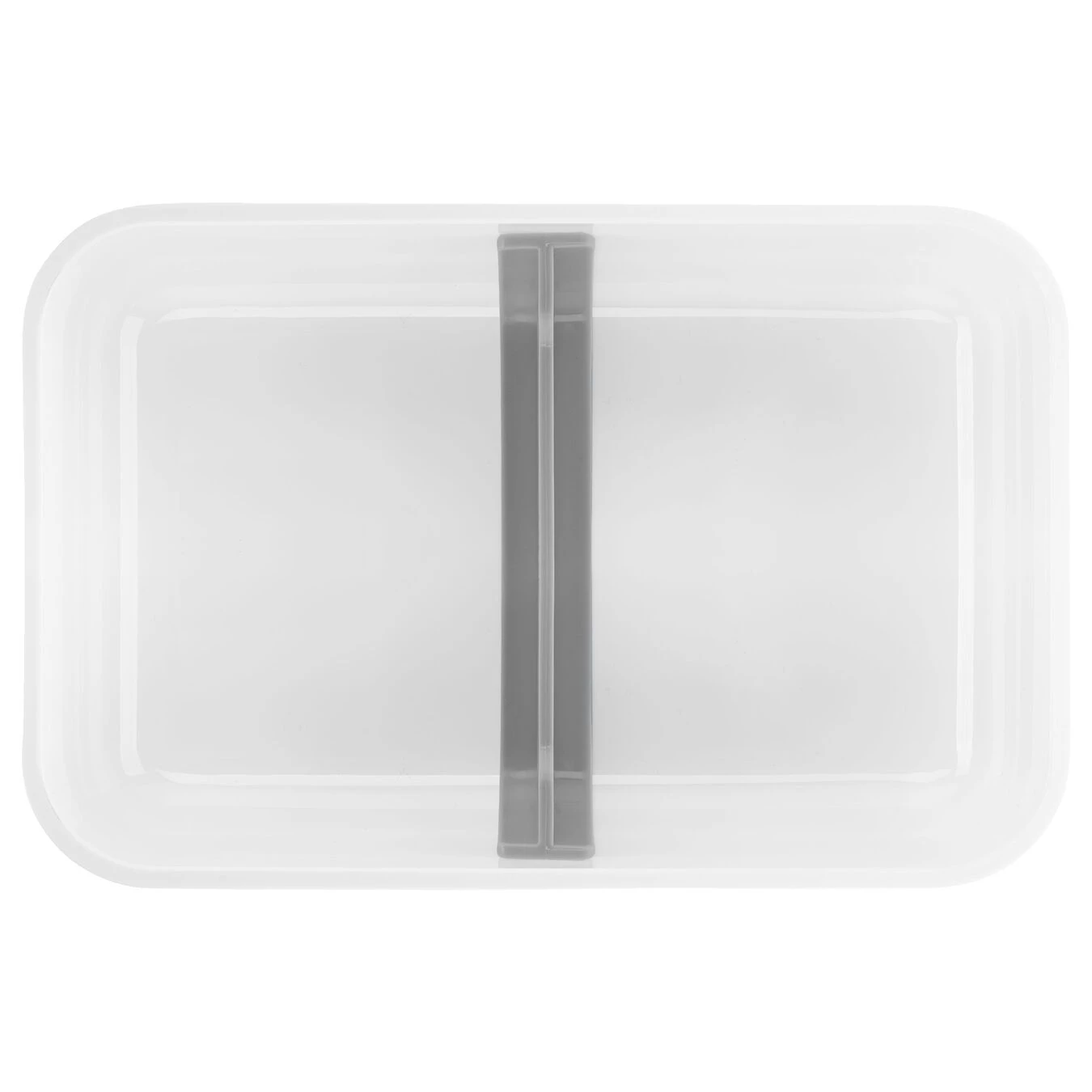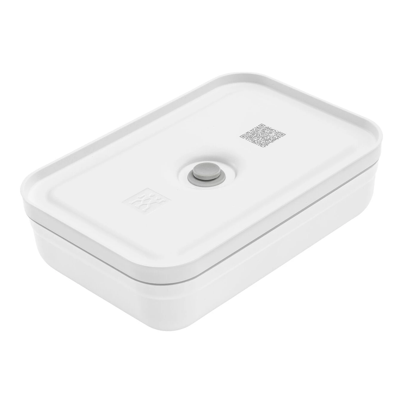Mehr Frische für die Frühstückspause: Mit der großen flachen ZWILLING FRESH & SAVE Vakuum Lunchbox L und ihrem Fassungsvermögen von 1000 ml genießt du Sandwiches und Butterbrote to go. Dank dem flexiblen Trenneinsatz passt auch noch Rohkost dazu, ohne dass das Brot durchweicht – ideal für jede Schulpause. Und weil die Vakuum-Box für Brot aus bruchsicherem Kunststoff besteht und unter Vakuum auslaufsicher ist, wird auch der Weg zum Büro kein Problem für sie. Um die Box auch nach Gebrauch zuverlässig zu verschließen, gibt es die separat erhältlichen elastischen Bänder. Aber auch zu Hause weiß die Snackbox zu glänzen: Sie ist extra flach, findet sie in jedem Kühlschrank Platz und kann mühelos gestapelt werden. Das begünstigt eine ideale Nutzung von begrenztem Platz in Kühlschrank und Eisfach. Aber das Beste ist die Vakuumierfunktion der Brotdose. Mit der ZWILLING FRESH & SAVE Vakuumpumpe entziehst du der Box in Sekundenschnelle die Luft. Deine Vorräte bleiben so bis zu fünfmal länger frisch als bei herkömmlicher Lagerung ohne Vakuum. Weil die flache Lunchbox dabei luftdicht und geruchssicher ist, bei gleichzeitiger voller Bewahrung des Aromas, ist sie ideal zur Aufbewahrung von Käse und Aufschnitt geeignet. Damit du bei deinen Vorräten nie den Überblick verlierst, gibt es die ZWILLING Culinary World App. Scanne einfach den QR-Code auf dem Deckel ein und tracke deine Lebensmittel.