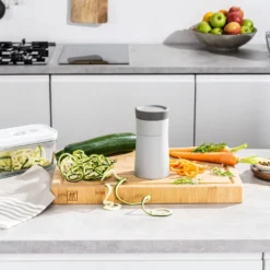 Dieses Set ist dein neues Dreifach-Pro für frisches Buntes. Denn es beinhaltet eine ZWILLING Z-Cut Multi-Reibe mit scharfer Zwei-Wege-Reibetechnologie, einen ZWILLING Z-Cut Spiralschneider für feine Obst- und Gemüsenudeln und die ideal dazu passenden Frischhalteboxen. Letztere eignen sich ideal, um frisch zubereitete Zutaten und Gerichte bis zu fünfmal länger frischzuhalten im Vergleich zur herkömmlichen Aufbewahrung ohne Vakuum. Die drei S, M, L-Boxen von ZWILLING FRESH & SAVE sind der ideale Ort für die frische Karotten- oder Gurkenpasta, die du kinderleicht mit dem 4-in-1-Spiralschneider im Set zubereiten kannst. Das formstabile, spülmaschinengeeignete Schneidgerät aus 18/10-Edelstahl zaubert dir leckere Spiralnudeln aus Obst, Gemüse und Rohkost für Beilagen, Garnituren oder Nachspeisen. Die ideale Ergänzung zur 7-in-1-Multi-Reibe, die ebenfalls Teil des Sets ist. Mit ihr kannst du raspeln, hobeln, reiben und schneiden – alles stets formstabil, mit Anti-Rutsch-Pads und kompatibel zu deinen ZWILLING FRESH & SAVE Boxen M und L. So geht frische Küche einfach und lecker!