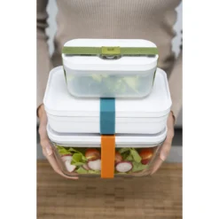 Denn was du zuhause mit der Vakuumpumpe vorbereitet hast, ist vielleicht im Büro oder in der Schule nicht mehr möglich: die Vakuumbox mit der Vakuumpumpe verschließen. Genau hier setzten unsere elastischen Bänder ein. Sie halten den Deckel an Ort und Stelle und sorgen so für einen zuverlässigen Verschluss, auch ohne Vakuum. Einfach eines der drei verschiedenfarbigen Bänder um die Vakuumbox binden und der Deckel sitzt fest auf der Box. Krümel bleiben, wo sie sind und deine Tasche bleibt sauber.