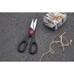 Eine scharfe Schere, die vielseitig einsetzbar ist, darf in keinem Haushalt fehlen. Wer lange Freude daran haben möchte, greift zur ZWILLING Vielzweckschere. Die 20 cm lange Schere liegt als Leichtgewicht in der Hand und zeigt ihre ganze Kraft, wenn es darum geht, etwas auf-, ab und durchzuschneiden. Klappt auch problemlos bei stärkeren Materialien. Dafür sorgen die robusten, handgeschliffenen Scherenblätter aus rostfreiem Edelstahl, der in einem speziellen Verfahren gehärtet wurde. Und die Mikroverzahnung fixiert das, was geschnitten werden soll, geradezu perfekt. Der integrierte Öffner hilft dir, beispielsweise festsitzende Drehverschlüsse zu lockern. Schönes Detail: die rote Feststellschraube mit ZWILLING Logo. Sollte es nötig sein, kannst du damit die Scherenblätter nachjustieren.